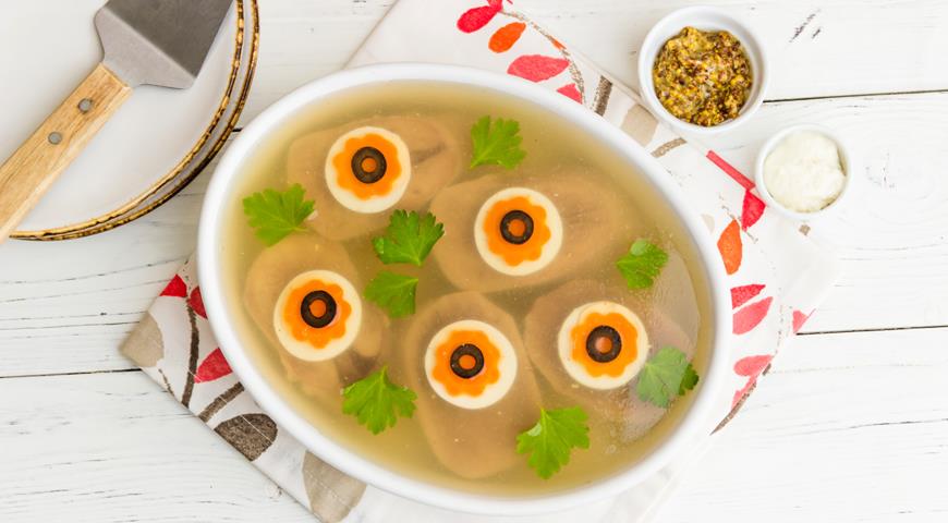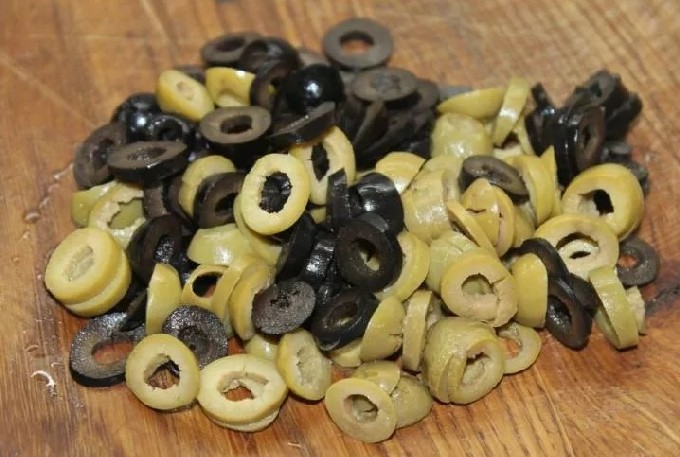 - Olijven en olijven in ringen snijden. Je kunt ze mengen, of je kunt ze in lagen leggen. Giet de bouillon door een fijne zeef. Verwarm de bouillon, voeg de voorgeweekte gelatine toe, roer tot het is opgelost en voeg eventueel zout toe.
