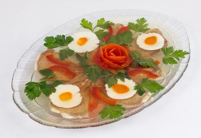 - Snijd de in die tijd afgekoelde tong in stukjes van de gewenste vorm en leg ze in de borden. Voeg voor decoratie greens, ingeblikte maïs of erwten en gekookte eieren naar wens toe. Giet de tong met een nog warme bouillon en zet 3 uur in de kou tot de gelei hard wordt.