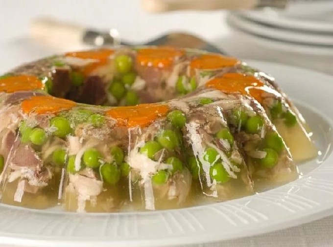 Aspic koken is een leuke bezigheid. Hoe meer kleuren het bevat van verschillende producten, hoe mooier het is en hoe gevarieerder het smaakpalet. Voor dit gerecht nemen we diepvrieserwten, dat smaakt er beter bij en gaat heel goed samen met rundvlees.