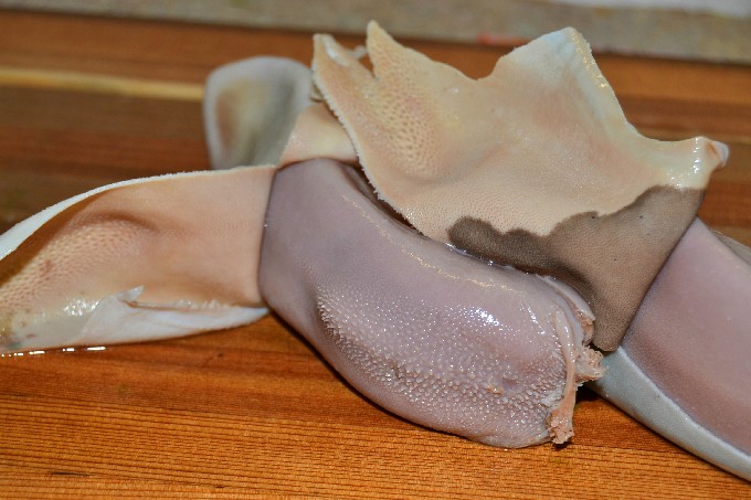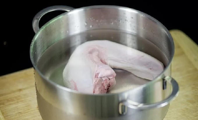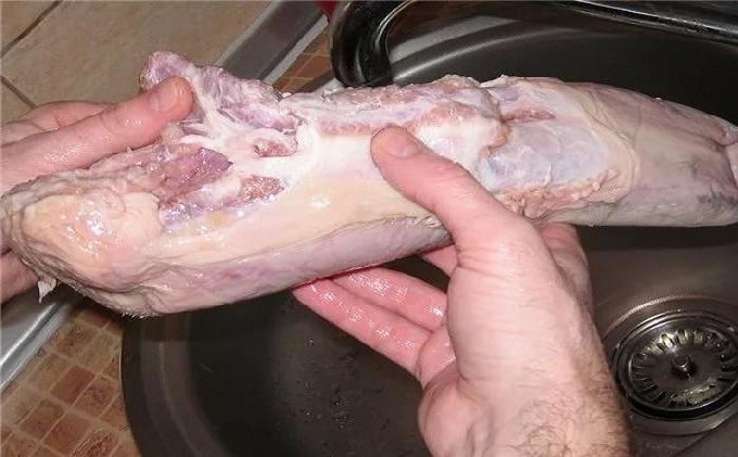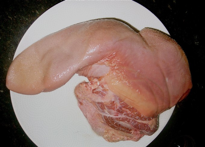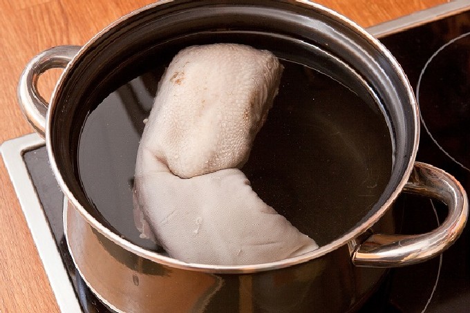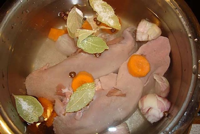 - We wassen de tong goed, reinigen hem van aderen en vet en laten hem vervolgens 6 uur in koud water met zout, laurier, peper weken, zo lang mogelijk. We reinigen de poten en vleugels van de kalkoen van veren, schubben en klauwen en andere onnodige elementen en spoelen goed af.