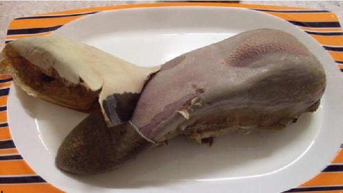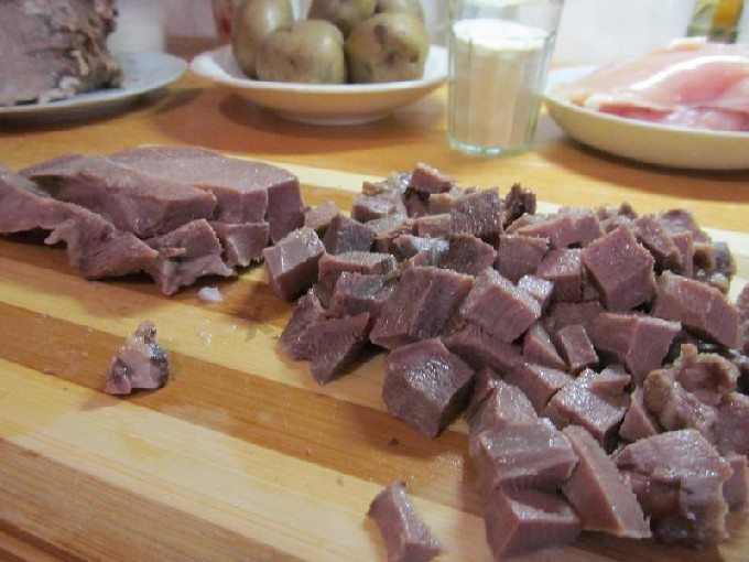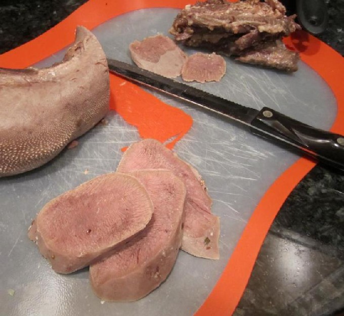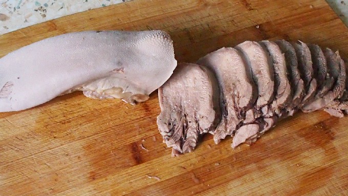 - De afgewerkte tong, nog heet, wordt ondergedompeld in een bak met water en ijs totdat deze is afgekoeld. We verwijderen de huid van de tong, beginnend bij de wortel. Snijd de helft van de tong dichter bij de basis in blokjes, de rest in platen van 0,5 cm.