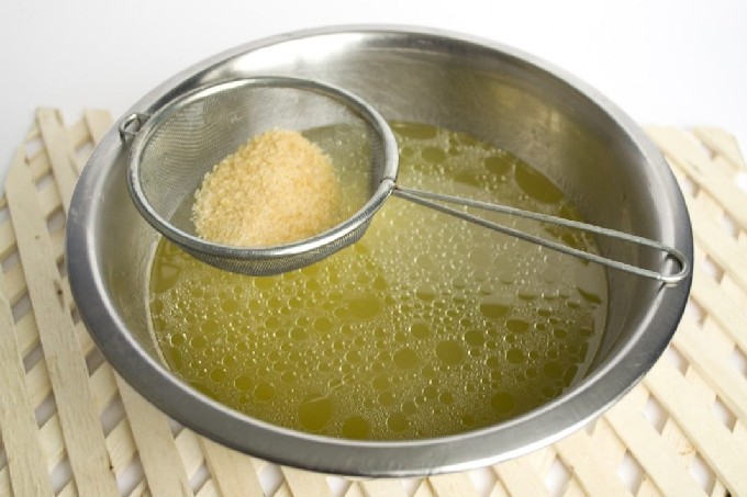 - Voeg gelatine toe aan een glas koud water volgens de instructies. Laat zwellen en giet in de bouillon, behoud de verhoudingen, roer.