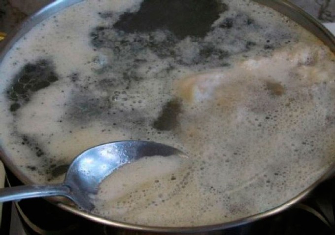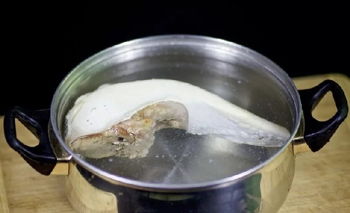 - Kook de tong tot hij gaar is, afhankelijk van de grootte, 2-3 uur. Doe 30 minuten voor het koken peperkorrels, een hele krop ui en een beetje zout in het water. We verwijderen het schuim van tijd tot tijd van het oppervlak.