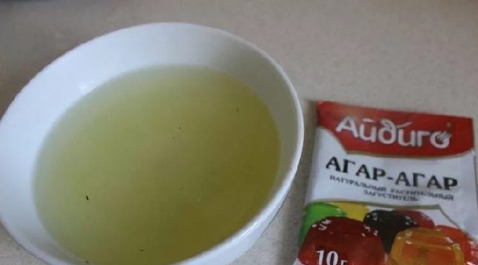 - Terwijl de tong kookt, nemen we de bouillon op. Zeef de bouillon en bereken de benodigde hoeveelheid agar-agar met een snelheid van 7 g per 500 ml. vloeistoffen. We zullen niet overbodig zijn om naar de verhoudingen in de instructies op de verpakking te kijken. Verwarm de bouillon en giet een glas warme vloeistof in een aparte pan, voeg agar-agar toe, meng en laat 15 minuten staan. Combineer dan met bouillon en zet opnieuw in brand, breng aan de kook, af en toe roeren. Haal van het fornuis.