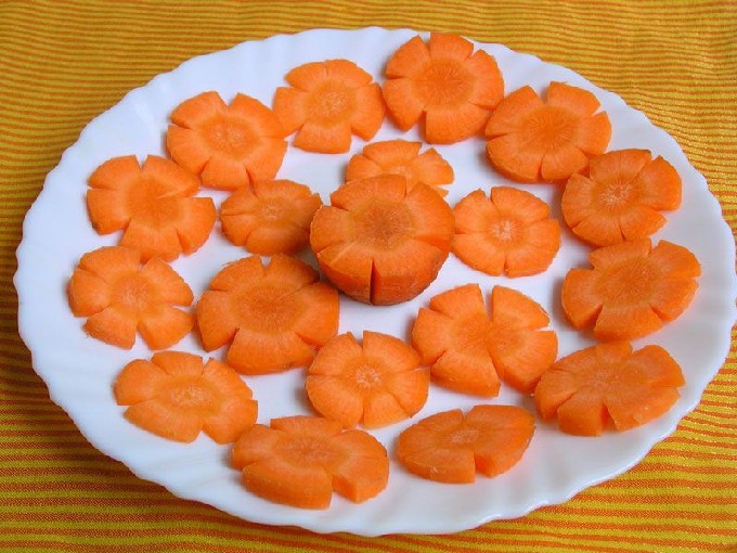 - Kwarteleitjes koken, schillen en halveren. Om mooie bloemen te krijgen van gekookte wortelen, maak je een hele groente 3-5 diepe groeven langs van rand tot rand. En dan in cirkels snijden. Snijd de tong in langwerpige reepjes. Was de peterselie en verdeel in blaadjes.
