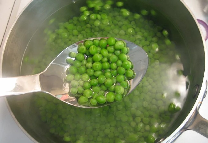 - Doe de erwten in een pan met kokend water en kook ze 2 minuten, keer ze om in een vergiet en laat ze afkoelen.We plaatsen 2/3 van de erwten op de bodem van de schaaltjes waarin we aspic gaan verzamelen. We leggen er plakjes tong, takjes peterselie en dille op en bestrooien terloops met de resterende erwten.