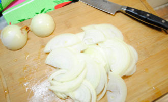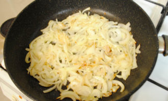 - Schil de ui, snijd in kleine stukjes en bak in plantaardige olie tot ze goudbruin zijn.
