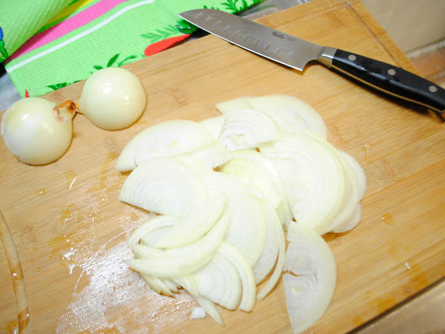 - Pel de ui, snij in kleine blokjes en bak goudbruin in een beetje zonnebloemolie.