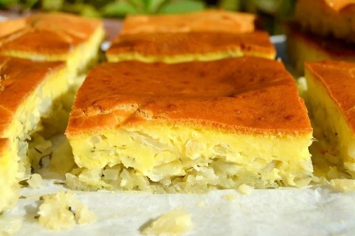 Het deeg voor een geleitaart, gemengd met zure room en kefir, blijkt bijzonder weelderig en zacht te zijn. Als je wilt, kun je verschillende kruiden, knoflook en gebakken wortelen met uien aan de koolvulling toevoegen.