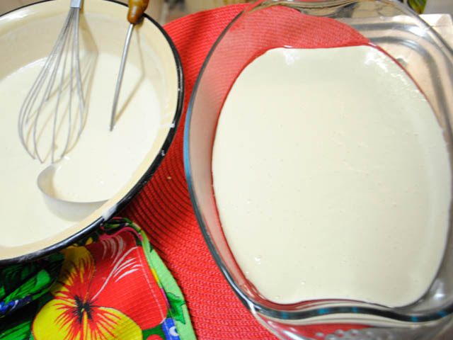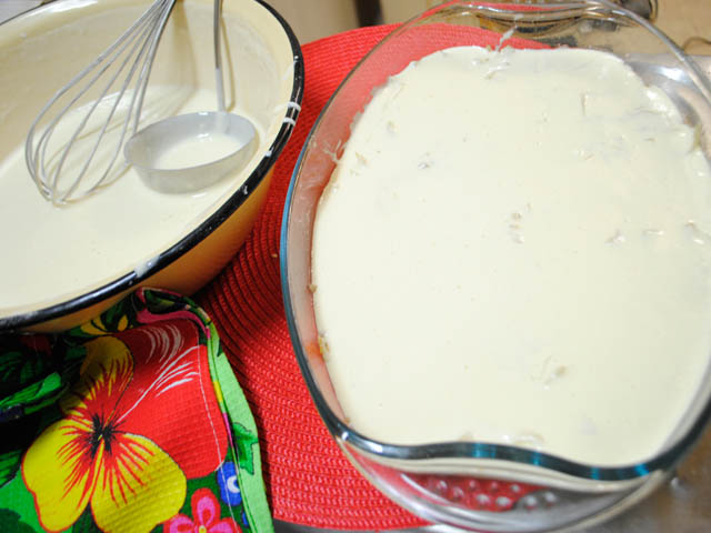 - Giet het deeg over de vulling en schud de vorm een beetje om het deeg gelijkmatig te verdelen.