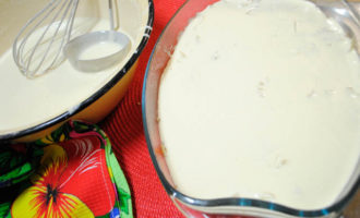 - Voeg mayonaise en warme kefir toe aan de losgeklopte eieren en roer opnieuw met een mixer.