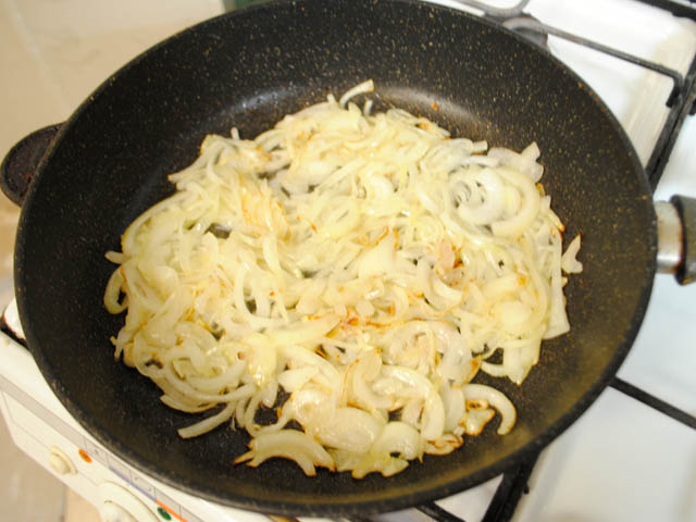 Bak de uien goudbruin in een voorverwarmde koekenpan met een beetje zonnebloemolie. Giet er vervolgens 1/3 kopje water bij en laat sudderen tot alle vloeistof is verdampt.