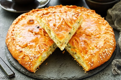 - Verdeel de vulling erover in een gelijkmatige laag. Bedek de vulling met de tweede helft van het deeg. Je kunt sesamzaadjes over de cake strooien.