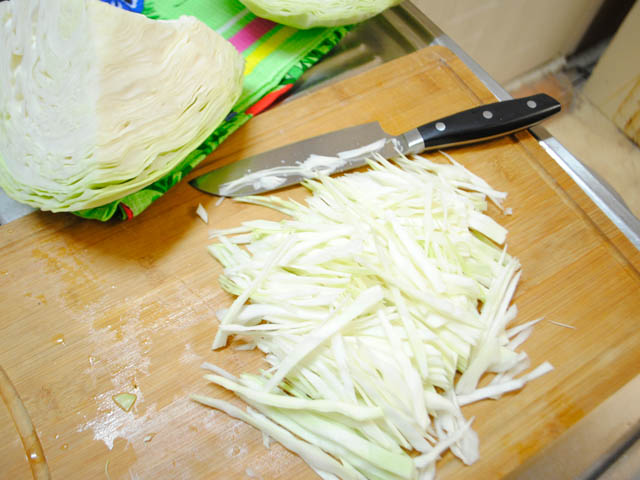 - Snijd verse kool in dunne reepjes, zout en wrijf een beetje met je hand zodat het krimpt en sap geeft.