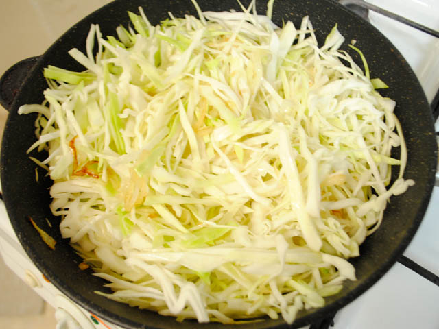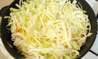 - Snijd de kool in dunne reepjes, bestrooi met zout en wrijf een beetje met je hand om sap te geven en het volume te verminderen. Bak de kool niet.