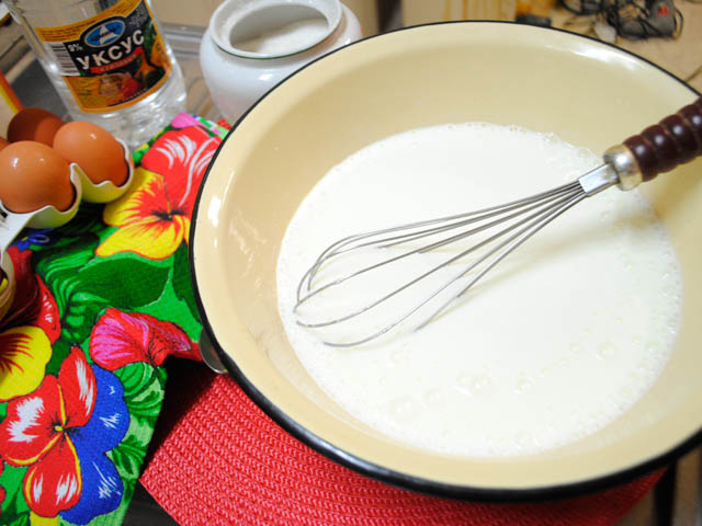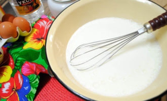 - Voeg vervolgens de benodigde hoeveelheid zure room en warme kefir toe aan de losgeklopte eieren en meng alles goed.