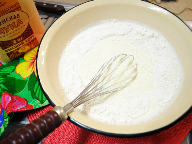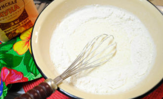- Zeef de benodigde hoeveelheid bloem in een kom om deeg te kneden en meng het met zuiveringszout.
