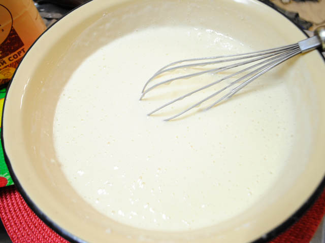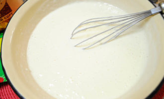 - Gebruik een mixer of garde om het deeg glad te kneden. Het moet een consistentie hebben zoals zure room.