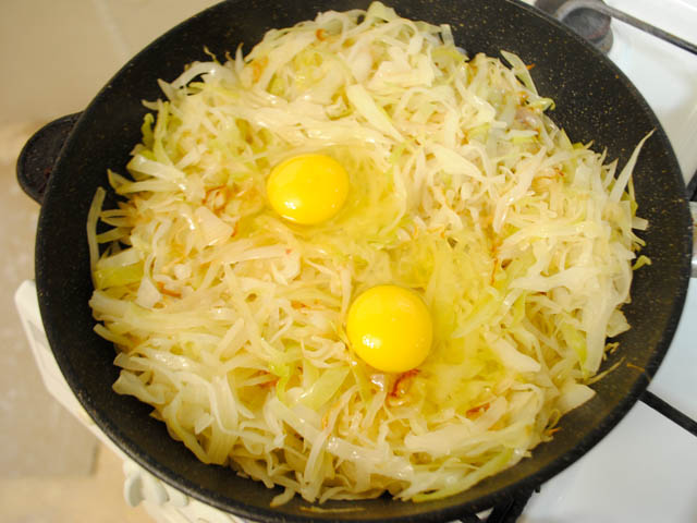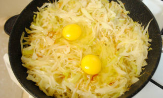 Klop twee eieren door de gebakken kool. Je kunt de eieren van tevoren koken, hakken en toevoegen aan de kool. Maar met rauwe eieren gaat het sneller.