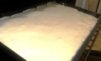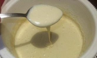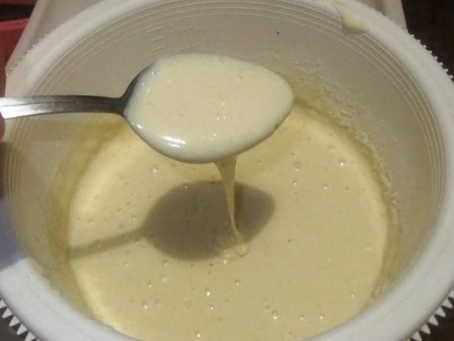 - Doe de gezeefde bloem in het deeg, klop nogmaals om de klontjes te verwijderen. De consistentie van het deeg zal lijken op dikke zure room.