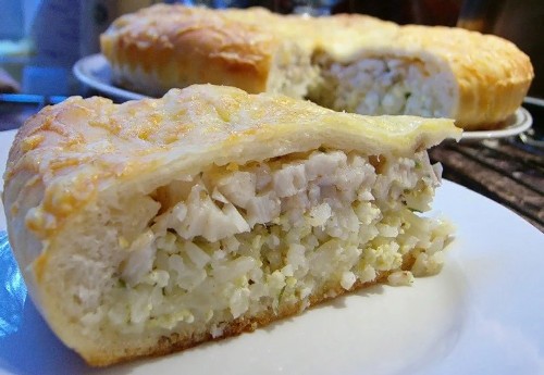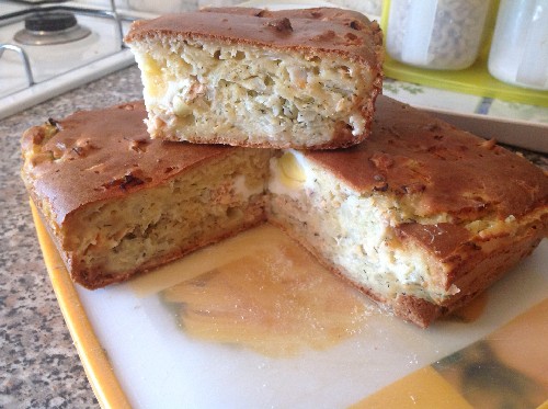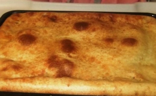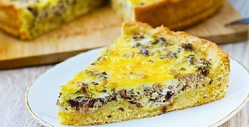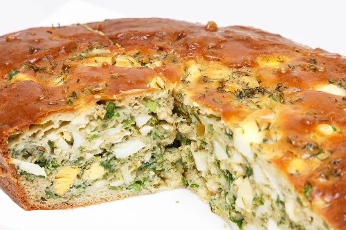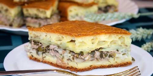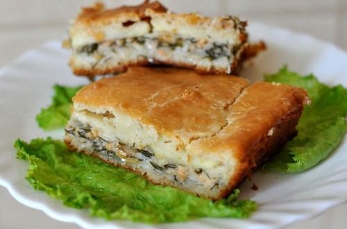Een van de snelste recepten van dit soort, de taart wordt gebakken in een pan onder het deksel. Het deeg wordt gekneed met zure room; de ingrediënten in de vulling kunnen worden gevarieerd afhankelijk van welk bijgerecht in de potten ligt.