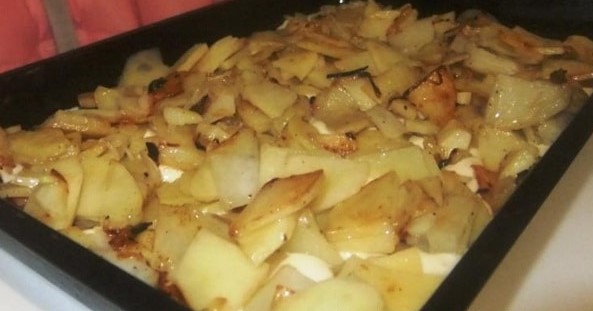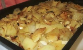- Verdeel de aardappelen over het oppervlak van het deeg en knijp het sap eruit als het eruit komt. De volgende laag is ingeblikte vis en dan uien. Giet de rest van het deeg op de vulling en verdeel het voorzichtig over de hele vorm.