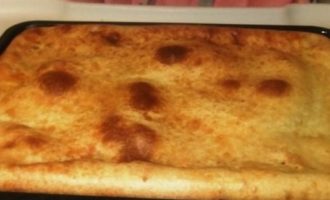 - Vet een ovenschaal in en bestrooi met paneermeel of griesmeel. Giet de helft van het deeg op de bodem van de vorm, verdeel de vulling gelijkmatig over het oppervlak met een lepel, giet de rest van het deeg erop.