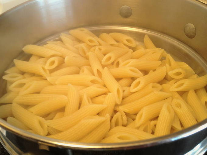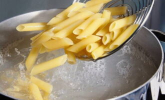 - We verzamelen een pot water en zetten het op het vuur, wachten tot het kookt. Giet pasta in het reeds gekookte water, voeg wat zout toe, roer voor de eerste keer, kook tot het gaar is. Voor elk type pasta is de kooktijd individueel: je kunt het op de verpakking verdrinken. Giet vervolgens het water af met een vergiet en zet de pasta even opzij.