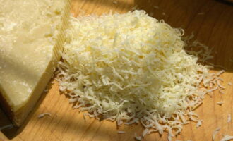 We wrijven de kaas op elke rasp die je lekker vindt: kies groot of klein uit persoonlijke voorkeuren - in dit geval is het niet belangrijk.