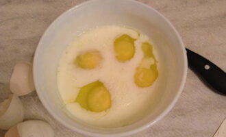 - Wij maken de vulling. Wrijf de kaas met een grove rasp. We rijden eieren in een container en voegen geraspte kaas toe. Roer en giet de melk erbij, meng nu grondig zodat de massa uniform van consistentie en kleur wordt. Giet pasta met gehakt.