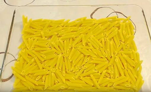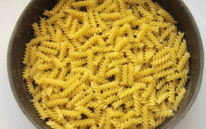 - Smeer de bodem van de ovenschaal in met olie. We verspreiden er pasta op gelijkmatig over het hele gebied. Je hoeft ze niet van tevoren te koken, de pasta moet droog zijn.