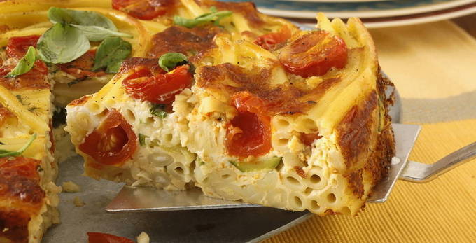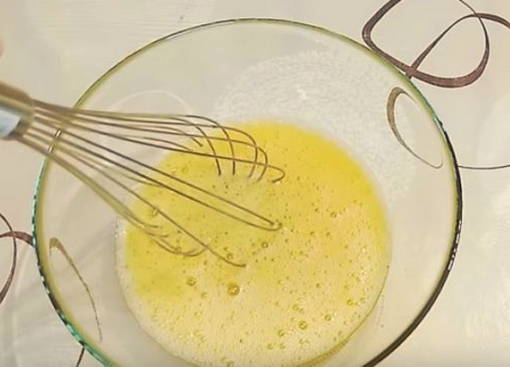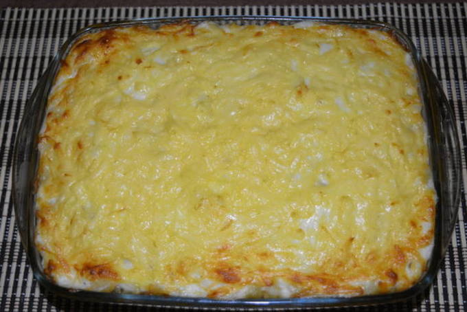 - Laten we een vulling nemen. Klop eieren en zout tot een gladde massa. Giet de melk erbij en na een minuut water. Klop goed.Giet over de pasta en bedek met kaas.