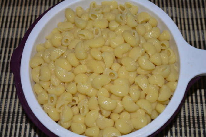 We verzamelen een pot water en zetten het op het vuur, wachten tot het kookt. Giet pasta in het reeds gekookte water, voeg wat zout toe, roer voor de eerste keer, kook tot het gaar is. Voor elk type pasta is de kooktijd individueel: je kunt het op de verpakking verdrinken. We moeten een minuut eerder stoppen met het koken van pasta. Giet vervolgens het water af met een vergiet en zet de pasta even opzij.