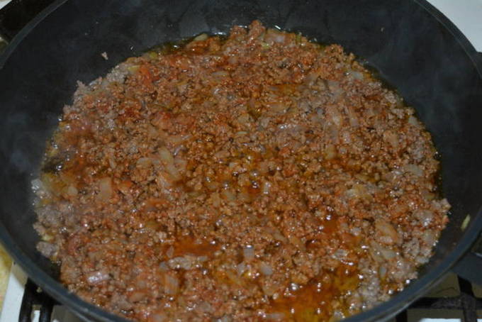 - We reinigen en snijden de ui van elke vorm: je kunt hem hakken, of je kunt hem in langwerpige plakjes snijden. We nemen een koekenpan, bevochtigen deze met plantaardige olie en leggen de reeds gesnipperde ui erop. Bak enkele minuten op middelhoog vuur. Voeg gehakt toe aan de ui, meng en bak 10 minuten. Doe daarna de tomatenpuree in de pan, meng opnieuw. Bak een beetje en voeg op het einde wat zout toe.