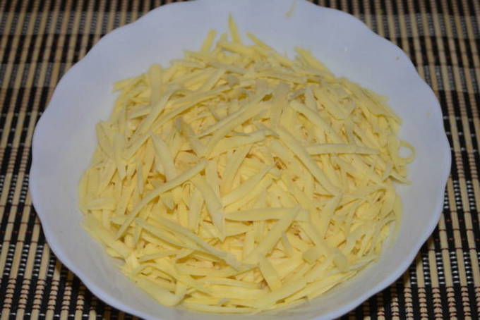 - We wrijven de kaas op elke rasp: kies groot of klein uit persoonlijke voorkeuren. Bedek de pasta met een laag gehakt of gekookt gehakt. Voeg zout en kruiden toe.