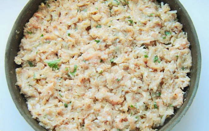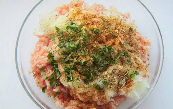 - We reinigen en hakken de ui. We wassen en hakken de greens fijn. Voeg deze ingrediënten toe aan het gehakt en voeg ook zout en kruiden toe. Goed mengen.