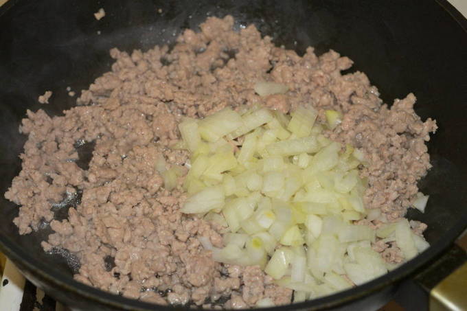 We snijden de ui in elke vorm: je kunt hem hakken, of je kunt hem in langwerpige plakjes snijden. We nemen een koekenpan, bevochtigen deze met plantaardige olie en leggen de reeds gesnipperde ui erop. Bak enkele minuten op middelhoog vuur. Voeg gehakt, zout en kruiden toe aan de ui. Roer goed en bak 5 minuten.