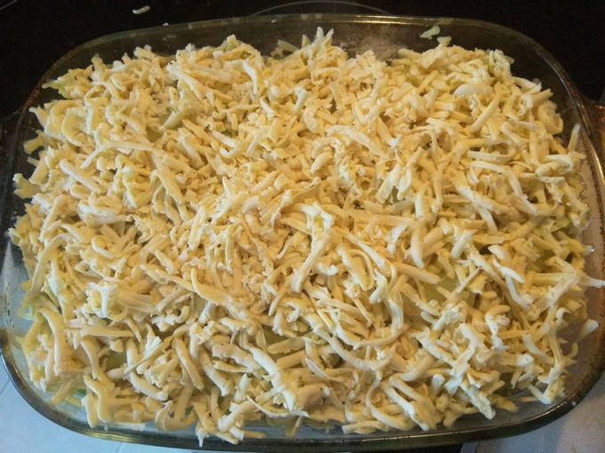 - Vet de ovenschaal in met plantaardige olie. Leg de pasta op de bodem strak tegen elkaar aan. Giet geraspte kaas op de pasta. We verdelen gehakt met groenten erop: je kunt het een beetje invetten met mayonaise om het nog sappiger te maken. Leg de pasta weer neer en vul de bovenste laag helemaal met kaas.