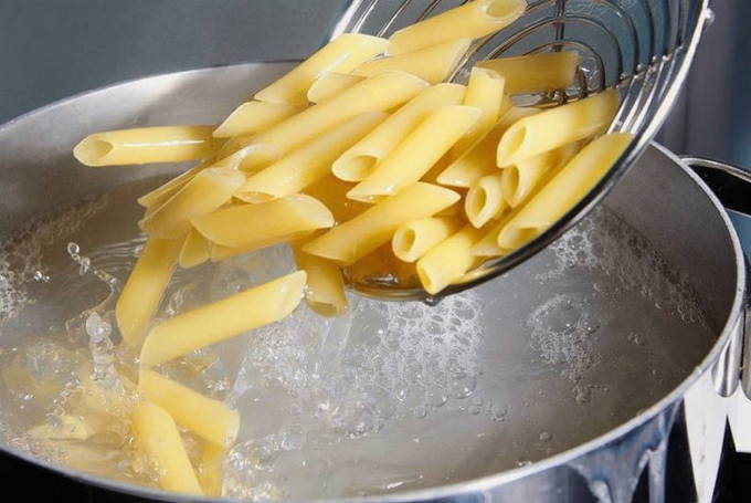 - We verzamelen een pot water en zetten het op het vuur, wachten tot het kookt. Giet pasta in het reeds gekookte water, voeg wat zout toe, roer voor de eerste keer, kook tot het gaar is. Voor elk type pasta is de kooktijd individueel: je kunt het op de verpakking verdrinken. Giet vervolgens het water af met een vergiet en zet de pasta even opzij.