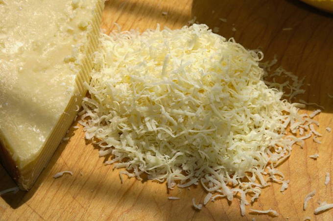 We wrijven de kaas op elke rasp die je lekker vindt: kies groot of klein uit persoonlijke voorkeuren - in dit geval is het niet belangrijk.