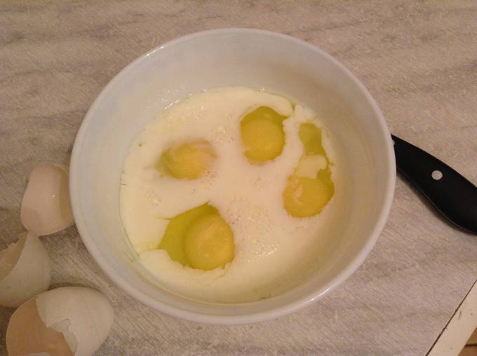 - Laten we een vulling nemen. Klop eieren en zout tot een gladde massa. Giet de melk erbij en na een minuut water. Klop goed.Giet over de pasta en bedek met kaas.