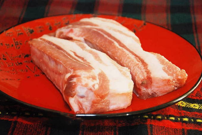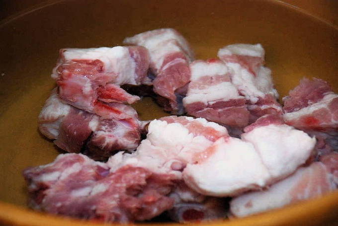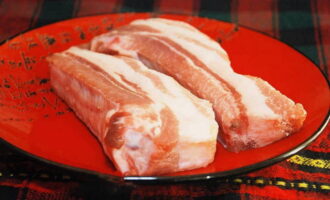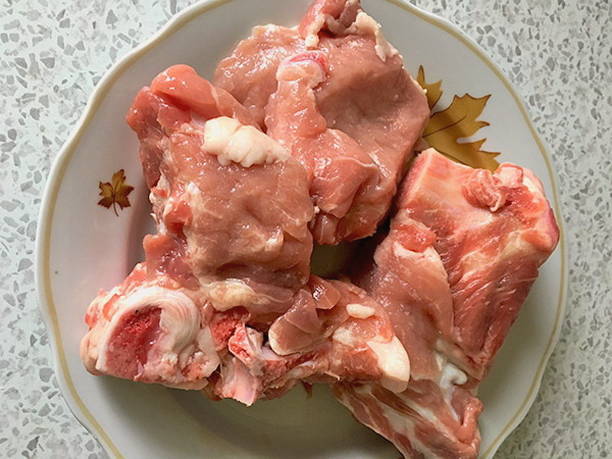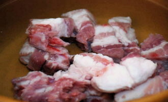 De soepbereiding begint met bouillon. Je kunt het koken op basis van bouillonblokjes of vlees vlak voor het koken van borsjt, of je kunt het van tevoren koken en bevroren bewaren, ontdooien indien nodig. In dit recept is de bouillon gebaseerd op varkensribbetjes. Spoel ze eerst af onder stromend water en verdeel het hele bord in kleinere stukken, elk 1-3 ribben, afhankelijk van de grootte.