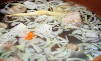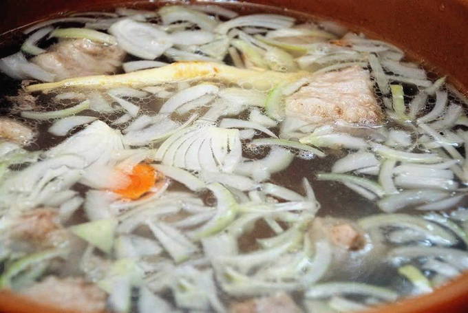 Giet 1,5 liter water in een pan, doe het vlees erin en breng aan de kook. Gebruik een schuimspaan om het schuim te verwijderen en laat ongeveer 30 minuten sudderen.