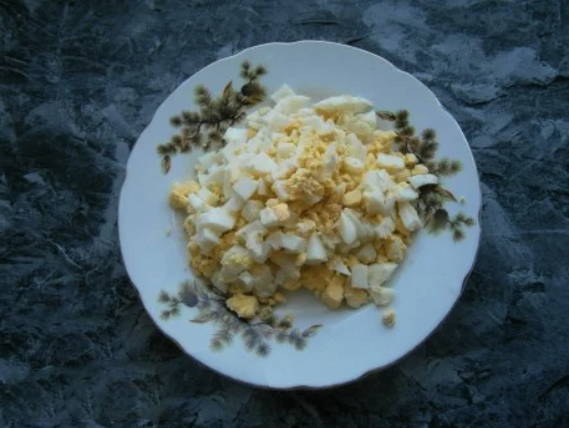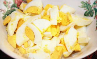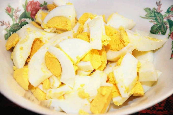 - Kook de eieren hardgekookt, koel af, pel ze en snijd ze in middelgrote stukken.