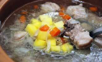 Als de bouillon gaar is, het oppervlak zo nodig afschuimen en de laurierblaadjes verwijderen. Haal het vlees uit de pan, scheid het van de botten, snijd het in middelgrote stukken en doe het terug in de bouillon. Schil de aardappelen, snijd ze in kleine blokjes, doe ze in de soep en kook verder op laag vuur. Voeg in dit stadium ook zout en peper naar smaak toe.
