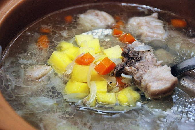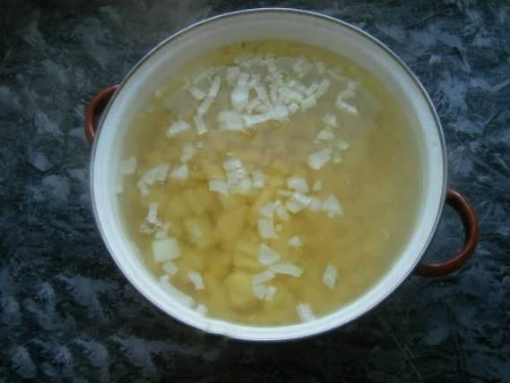 - Was de aardappelen onder stromend water, schil ze en snijd ze in middelgrote blokjes. Spoel ze ook af met water om overtollig zetmeel te verwijderen en de soep minder troebel te maken. Voeg aardappelen, vlees en kruiden toe aan de bouillon, breng aan de kook.