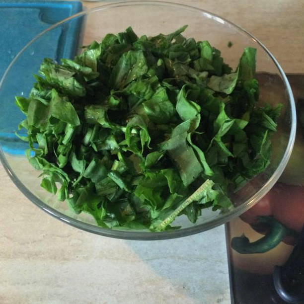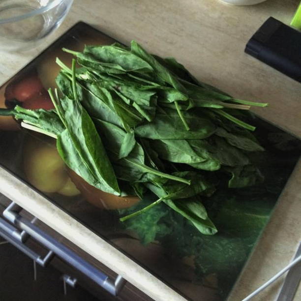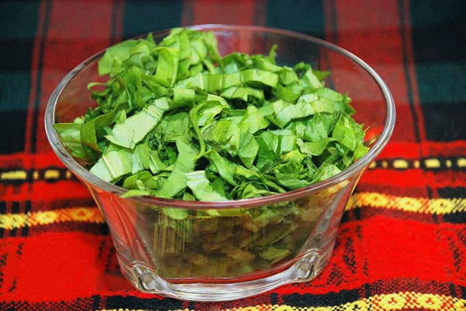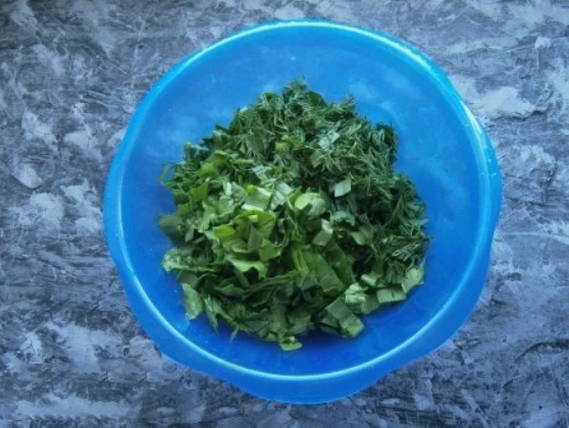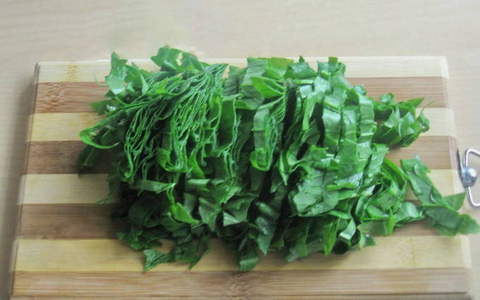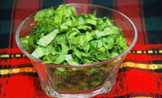 - Spoel intussen de zuring, scheid de greens van de stekken, selecteer de bedorven bladeren en hak de overige willekeurig fijn.