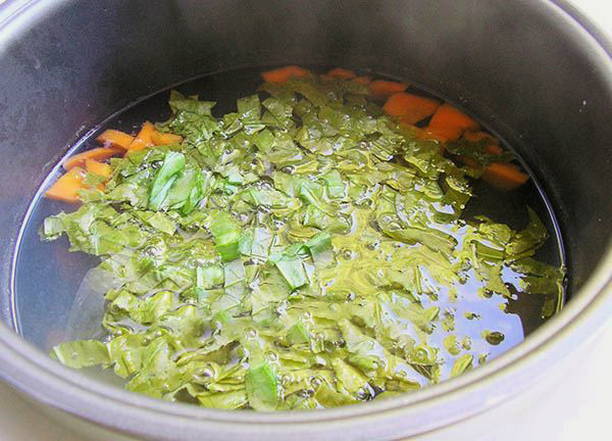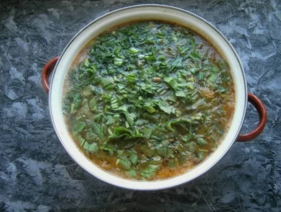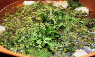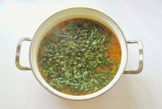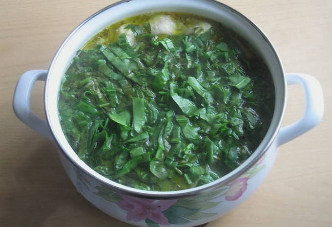 - Spoel de zuring, selecteer de bedorven bladeren en snijd in reepjes van ongeveer 1 centimeter breed. Als de groenten in de bouillon gaar zijn, de zuring in de soep doen en nog 5-6 minuten laten koken.