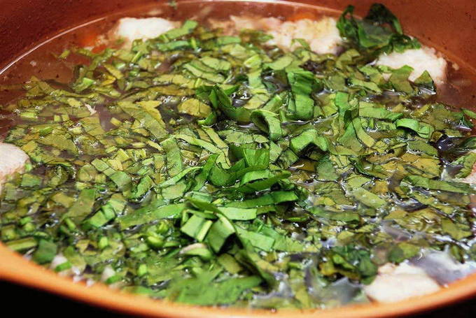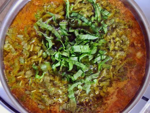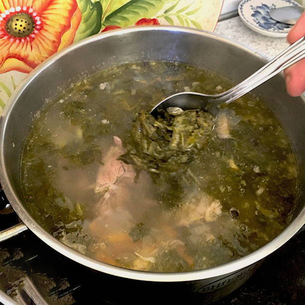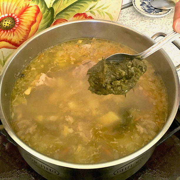 - Spoel de zuring onder stromend water, zoek naar bedorven bladeren, scheid de kruiden van de stekken en snijd in reepjes van ongeveer 1 centimeter breed. Spoel en hak ook de dille. Als de aardappelen gekookt zijn, doe de kruiden in de soep, voeg de kruiden toe, roer alles, breng aan de kook en dek af.