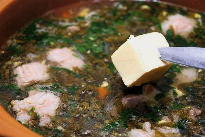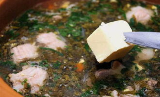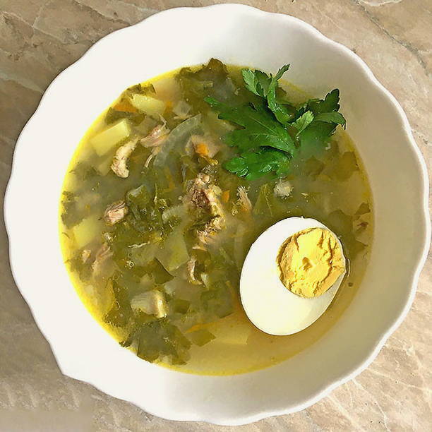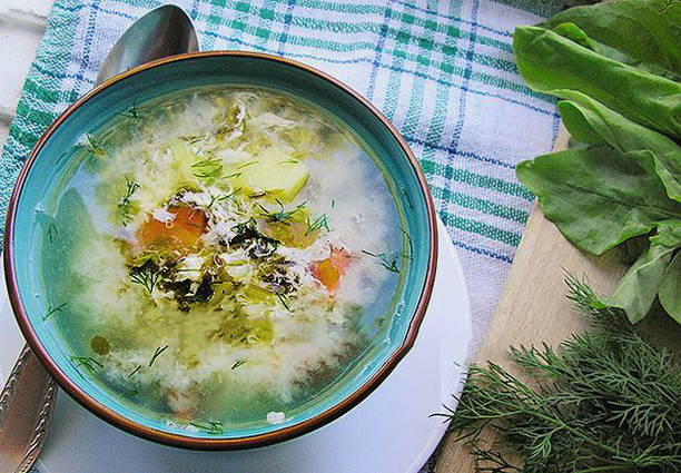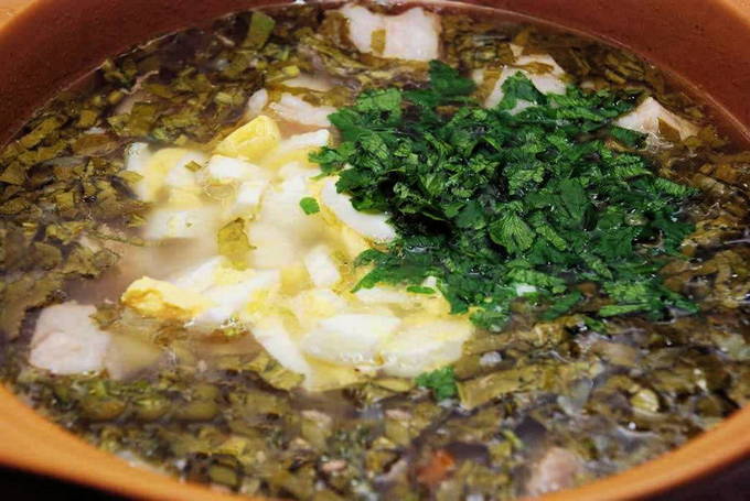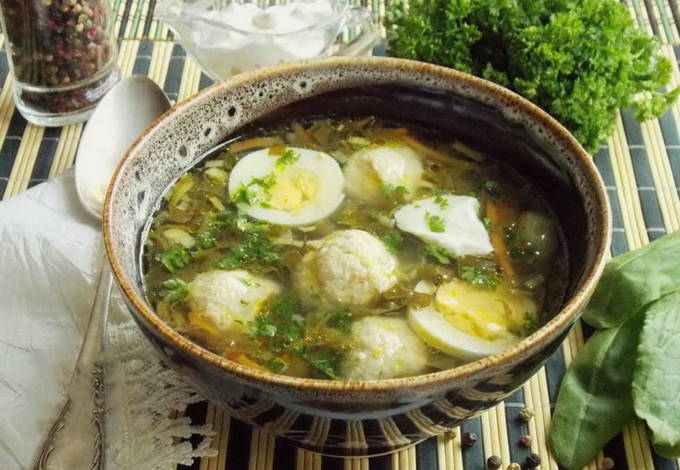 Het ei in de soep veroorzaakt een lichte zuurheid van de zuring, en de gehaktballen, vooral de gefrituurde, zullen het gerecht een interessantere smaak geven dan alleen gekookt vlees, en zullen er ook aantrekkelijker uitzien voor kinderen.